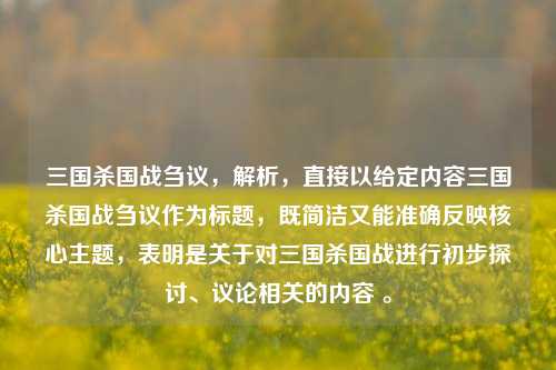 本文围绕三国杀国战展开刍议,三国杀国战作为一款热门桌游,有着独特的玩法与魅力,它以三国历史为背景,众多武将角色各展风采,玩家需巧妙组合武将技能,制定策略,在不同局势下抉择,国战过程充满变数与博弈,团队配合与个人智谋都至关重要,其不仅能带来娱乐体验,还能让人深入感受三国文化,从武将平衡到玩法创新,从新手入门到高手进阶,三国杀国战在诸多方面都值得探讨,以不断优化游戏体验,吸引更多玩家沉浸于这一独特的三国世界。