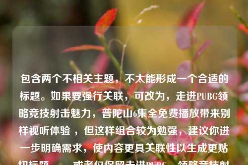 包含两个不相关主题,不太能形成一个合适的标题。如果要强行关联,可改为,走进PUBG领略竞技射击魅力,普陀山6集全免费播放带来别样视听体验 ,但这样组合较为勉强,建议你进一步明确需求,使内容更具关联性以生成更贴切标题 。,或者仅保留走进PUBG,领略竞技射击游戏的魅力作为标题,走进PUBG,领略竞技射击游戏的魅力 。,又或者仅保留走进普陀山6集全免费播放作为标题,走进普陀山 6 集全免费播放 。