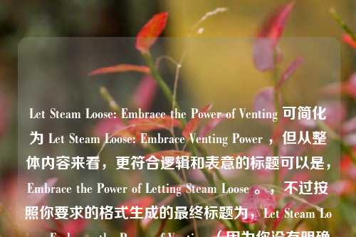 Let Steam Loose: Embrace the Power of Venting 可简化为 Let Steam Loose: Embrace Venting Power ,但从整体内容来看,更符合逻辑和表意的标题可以是,Embrace the Power of Letting Steam Loose 。,不过按照你要求的格式生成的最终标题为,Let Steam Loose: Embrace the Power of Venting (因为你没有明确是否要对内容进行进一步简化等操作,所以