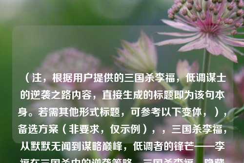 (注,根据用户提供的三国杀李福,低调谋士的逆袭之路内容,直接生成的标题即为该句本身。若需其他形式标题,可参考以下变体,),备选方案(非要求,仅示例),,三国杀李福,从默默无闻到谋略巅峰,低调者的锋芒——李福在三国杀中的逆袭策略,三国杀李福,隐藏谋士的制胜之道